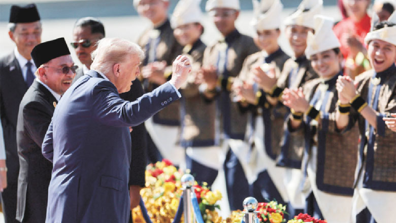 എ​​​യ​​​ർ​​​ഫോ​​​ഴ്സ് വ​​​ൺ വി​​​മാ​​​ന​​​ത്തി​​​ൽ​​​നി​​​ന്നി​​​റ​​​ങ്ങി​​​യ ട്രം​​​പ് മ​​​ലേ​​​ഷ്യ​​​ൻ പ്ര​​​ധാ​​​ന​​​മ​​​ന്ത്രി അ​​​ൻ​​​വ​​​ർ ഇ​​​ബ്രാ​​​ഹി​​​മി​​​നൊ​​​പ്പം മു​​​ന്നോ​​​ട്ടു നീ​​​ങ്ങ​​​വേ, സ്വീ​​​ക​​​ര​​​ണ​​​പ​​​രി​​​പാ​​​ടി​​​യു​​​ടെ ഭാ​​​ഗ​​​മാ​​​യി പ​​​ര​​​ന്പ​​​രാ​​​ഗ​​​ത വേ​​​ഷ​​​ത്തി​​​ൽ നൃ​​​ത്തം ചെ​​​യ്യു​​​ന്ന സം​​​ഘ​​​ത്തെ ക​​​ണ്ട് ചു​​​വ​​​ടു​​​വ​​​യ്ക്കു​​​ക​​​യാ​​​യി​​​രു​​​ന്നു. അ​​​ൻ​​​വ​​​ർ ഇ​​​ബ്രാ​​​ഹി​​​മും നൃ​​​ത്ത​​​ത്തി​​​ൽ പ​​​ങ്കു​​​ചേ​​​ർ​​​ന്നു.