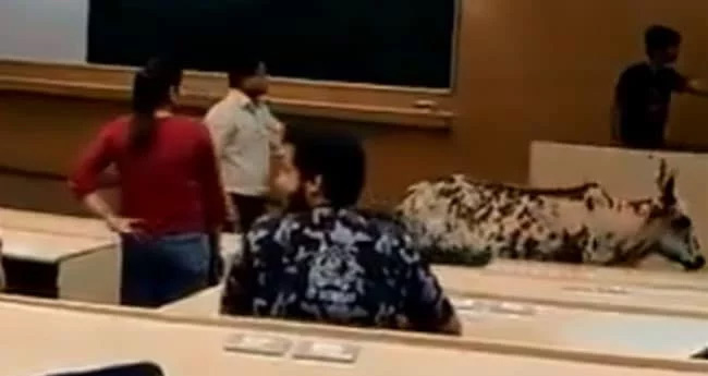 രാജ്യത്തെ ഏറ്റവും മികച്ച വിദ്യാഭ്യാസ സ്ഥാപനങ്ങളിലൊന്നായ ഐഐടി ബോംബെയിലെ ക്ലാസ് മുറിയിൽ പശു. അമ്പരന്ന് നിൽക്കുന്ന വിദ്യാർഥികളുടെ മുമ്പിൽ കൂടി പശു നടന്ന് നീങ്ങുന്നതിന്റെ അസാധാരണമായ ദൃശ്യങ്ങൾ സോഷ്യൽമീഡിയയിൽ ഏറെ ചർച്ചാ വിഷയമാകുകയാണ്.