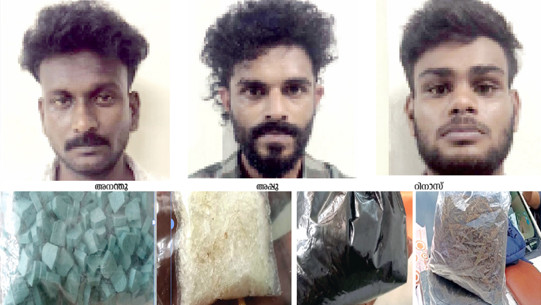 ആ​ല​പ്പു​ഴ മ​ണ്ണ​ഞ്ചേ​രി സ്വദേശി റി​നാ​സ്, തൃ​ശൂ​ര്‍ ജി​ല്ല​ക്കാ​ര​നാ​യ അ​ന​ന്തു, എ​റ​ണാ​കു​ളം ജി​ല്ല​യി​ലു​ള്ള അ​പ്പു എ​ന്നി​വ​രാ​ണ് പി​ടി​യി​ലാ​യ​ത്.