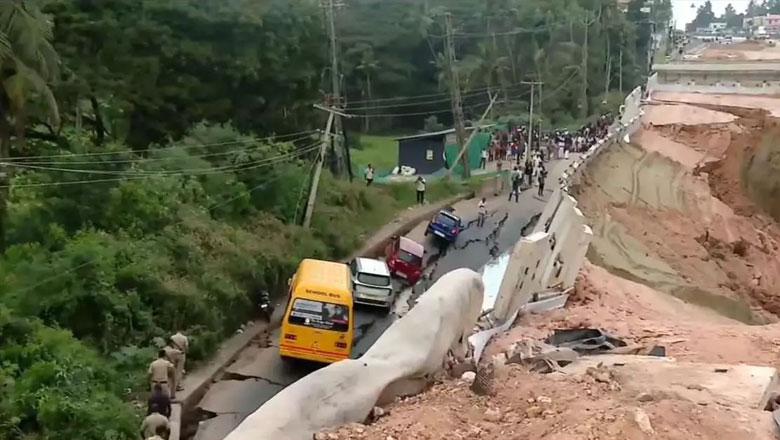 സം​ര​ക്ഷ​ണ​ഭി​ത്തി ഇ​ടി​ഞ്ഞ​തോ​ടെ സ​ർ​വീ​സ് റോ​ഡ് ത​ർ​ന്നു. ഈ ​സ​മ​യം ഇ​തു​വ​ഴി​യെ​ത്തി​യ സ്കൂ​ൾ ബ​സ് ഉ​ൾ​പ്പെ​ടെ നാ​ലു വാ​ഹ​ന​ങ്ങ​ൾ അ​പ​ക​ട​ത്തി​ൽ​പ്പെ​ട്ടു. അ​പ​ക​ട​ത്തി​ൽ ആ​ളു​ക​ൾ​ക്ക് പ​രി​ക്കി​ല്ല.