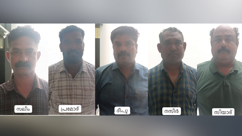 തൃക്കടവൂർ പനമൂട് കരിക്കവയൽ വീട്ടിൽ ദീപു എന്ന ഹരിസുധൻ(45), തൃക്കടവൂർ മുരുന്തൽ സജന മൻസിലിൽ നസീർ(42), തൃക്കടവൂർ കുപ്പണ തങ്കത്തെക്കതിൽ സലീം(52), തൃക്കടവൂർ നീരാവിൽ മണ്ണൂർ വടക്കതിൽ സുജിത്ത് എന്ന പ്രമോദ്(33) തൃക്കടവൂർ നീരാവിൽ സിയാദ്(42), എന്നിവരാണ് അഞ്ചാലുംമൂട് പോലീസിന്റെ പിടിയിലായത്.