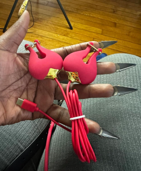 When I first opened the box I was shocked by the details of the toy. It comes with I pretty leather and metallic gold colored chain and collar. I love the stimulation I get from this toy! I have ð piercings too, and I was scared that the toy might injure them, but the toy clips onto them so gently that it just enhances the feeling!