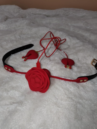 This must be the best nipple clamp toy I've ever played with. It's a tight fit, really really good vibration, the rose gag is soft, and the chain is a perfect bonus. You have to see if for yourself.